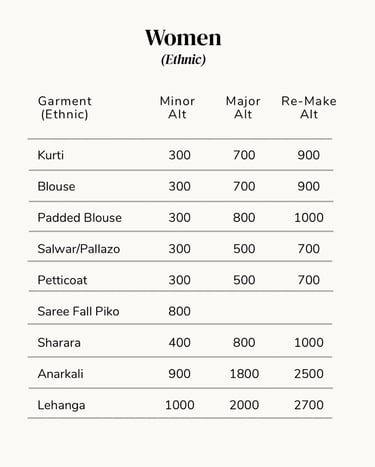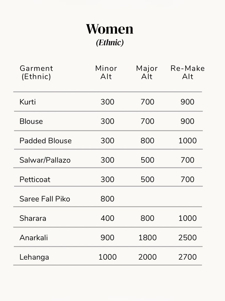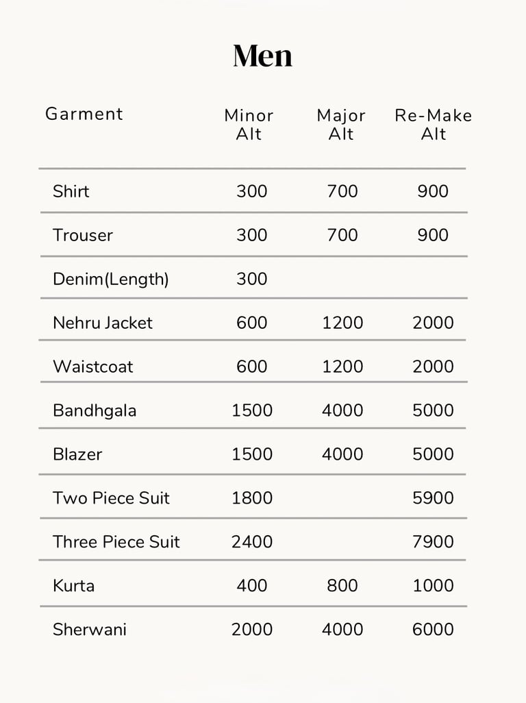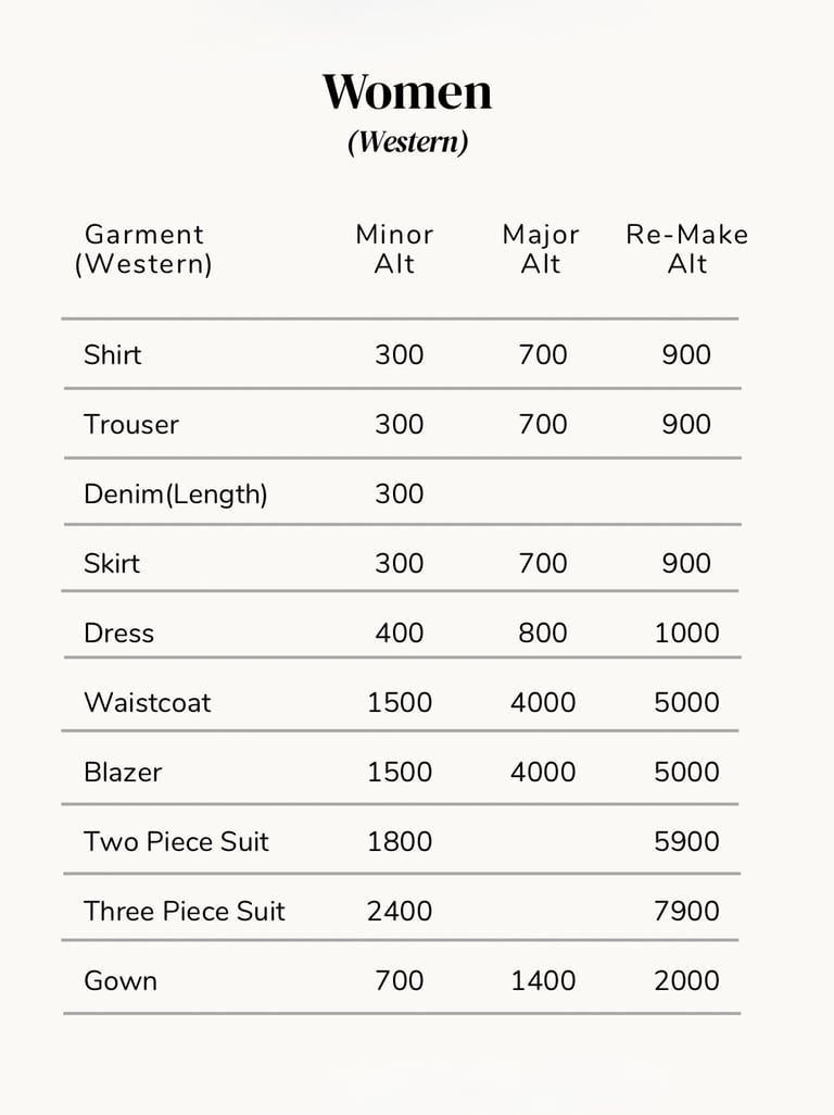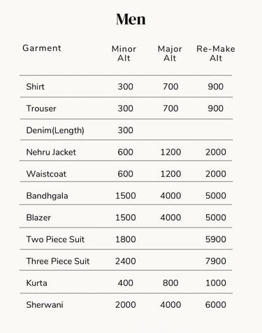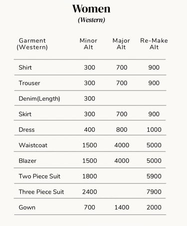 Our pricing reflects the precision, skill and care that goes into every alteration and up-cycle. Each garment is assessed individually to ensure the perfect fit and finish.